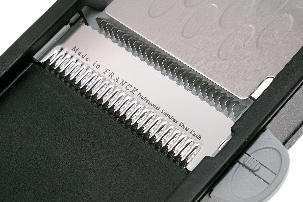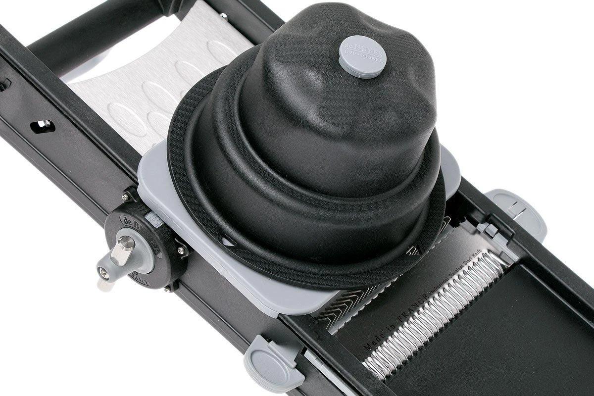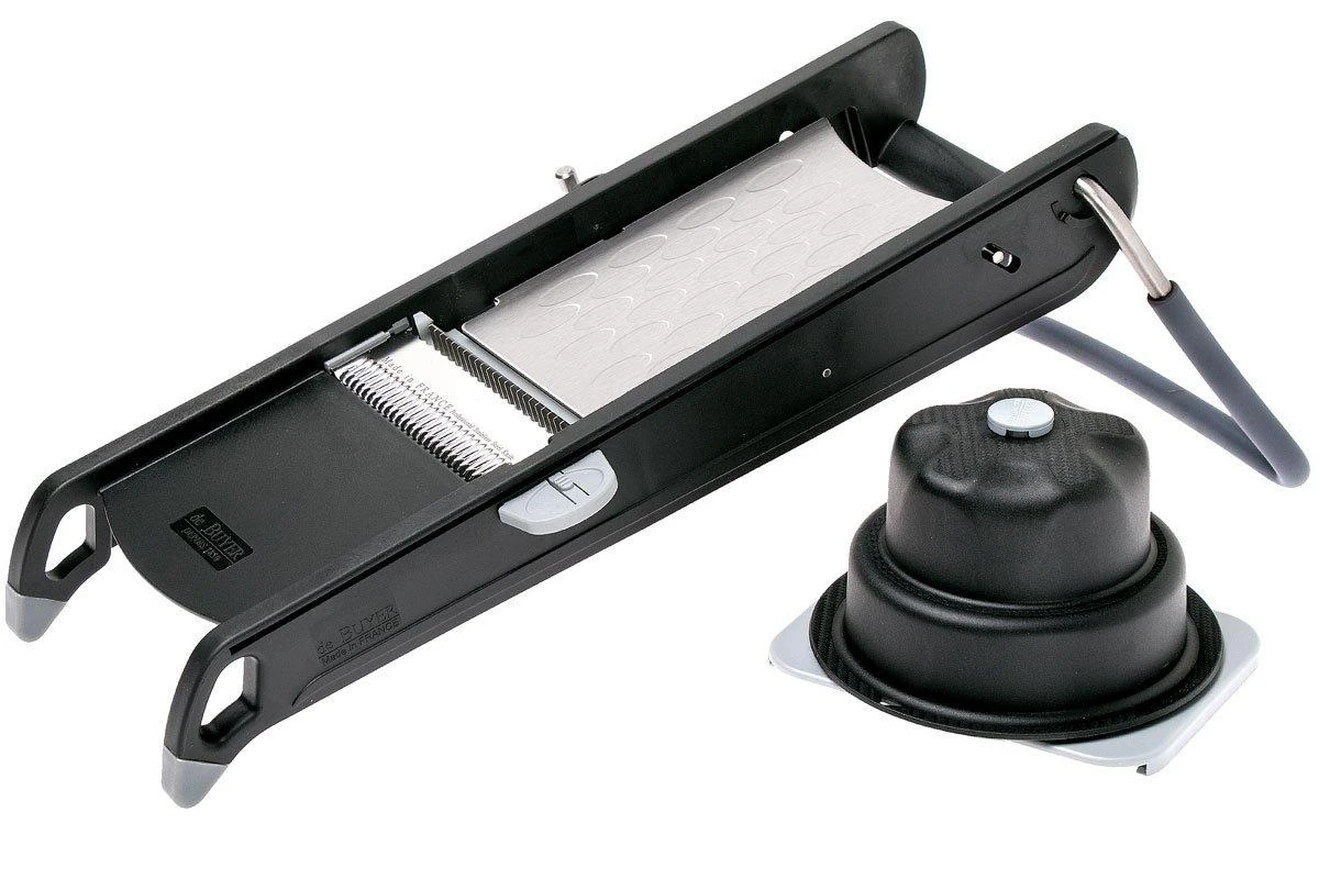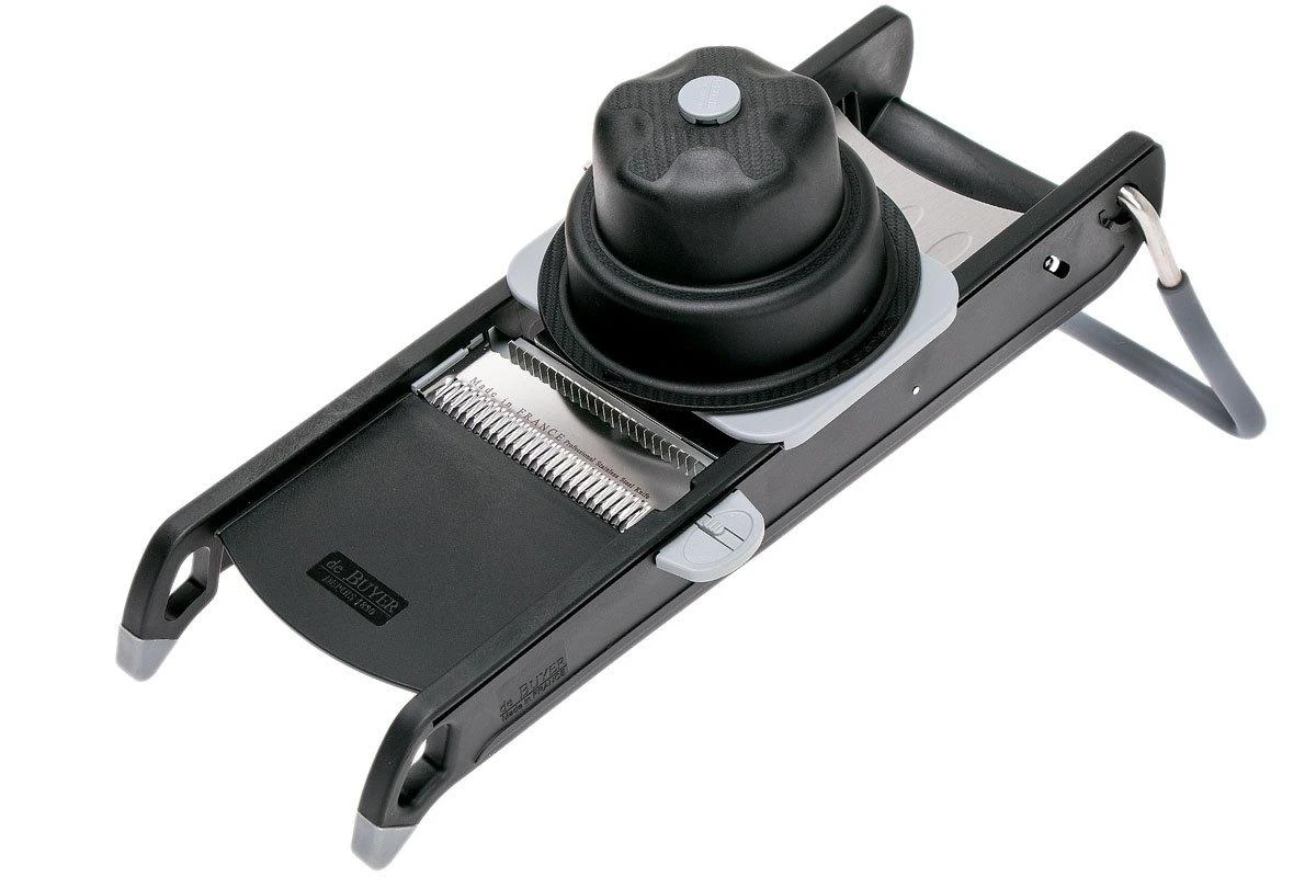 La de Buyer Swing Plus est une mandoline solide et bien conçue. Elle est livrée avec un peigne double julienne et une double lame. La plaquette de support en acier inoxydable avec alvéoles empêche les aliments de coller à la mandoline. La mandoline Swing Plus vous permet de couper vos légumes en julienne, en lanières en tranches ou en rondelles comme un chef : lisse, sûr et très pro !
