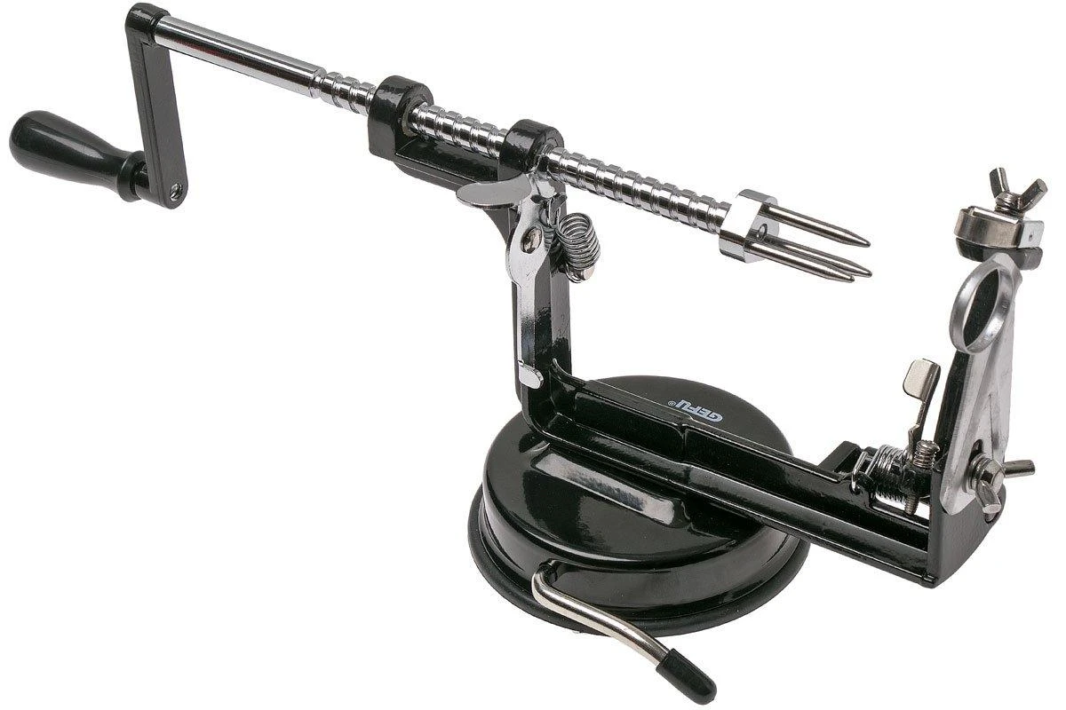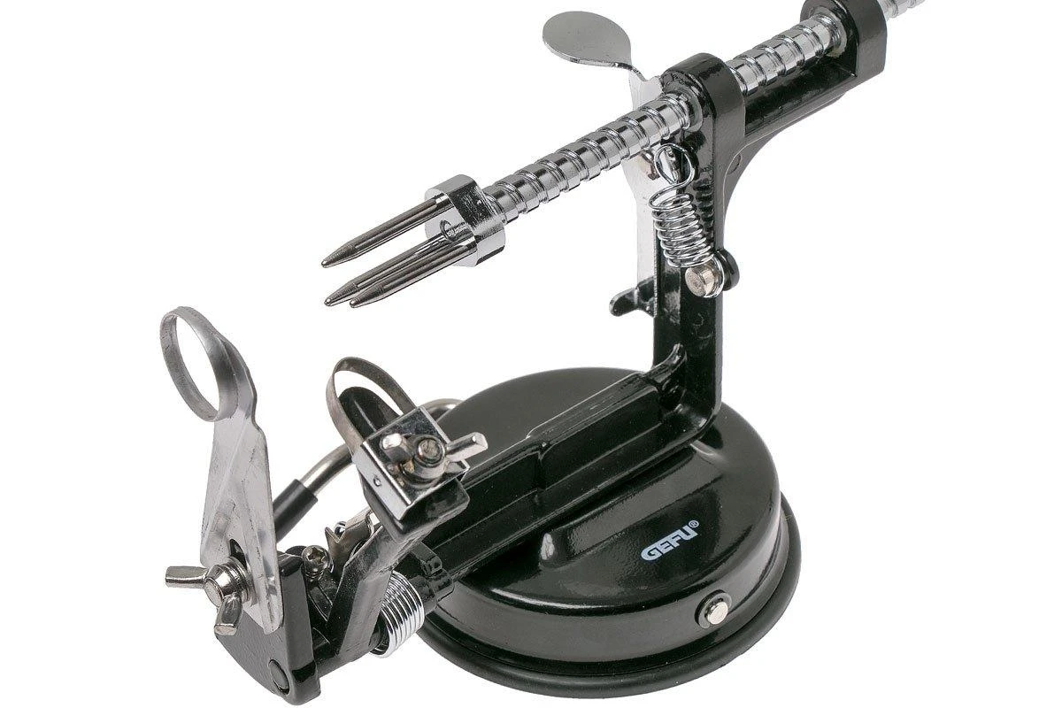 Cet éplucheur à pommes GEFU 3-in-1, fait en aluminium et inoxydable, est très esthétique et très pratique. Il permet d’éplucher, de percer et de trancher en un coup de main des pommes et des poires et de retirer leur coeur. Il est également utile pour les pommes de terre et les concombres. Fixez bien la pomme, appliquez-y la lame, tournez le manche et la pomme sera pelée et tranchée. Vous aurez alors une pomme parfaitement épluchée, de façon économique. Le gros avantage de cet éplucheur, c’est qu’on peut utiliser chaque fonction séparément. La pomme peut donc être uniquement pelée ou tranchée. Un appareil très polyvalent. Grâce à son socle à ventouse, cet éplucheur reste bien en place, même sur une surface glissante. Rincez l’appareil après utilisation sous le robinet ou passez-le au lave-vaisselle.