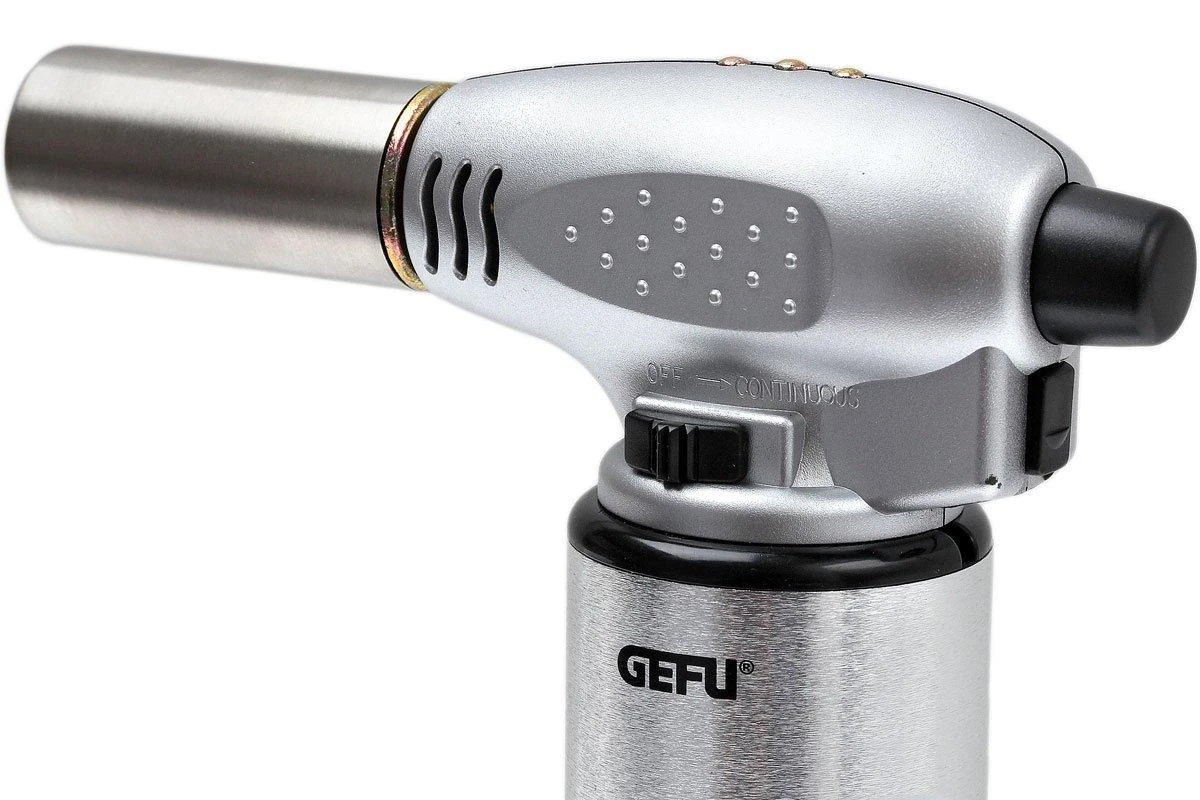 Avec le chalumeau de cuisine GEFU Fuego, caraméliser, gratiner ou réchauffer devient un jeu d’enfant. La flamme chauffe jusqu’à 1300°C et elle peut se régler sur plusieurs niveaux. Réglez-la donc selon l’usage que vous en faites. Ce chalumeau peut être utilisé pendant une longue période. Jusqu’à une durée totale d’une heure. Son socle inclus permet de le reposer en toute sécurité. La sécurité enfant en fait également un outil très sûr.