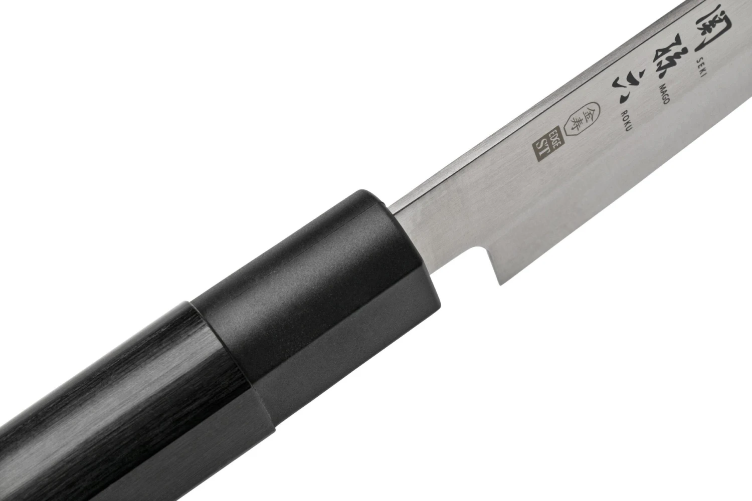 Le Yanagiba 18 cm Kai Seki Magoroku Kinju est idĂ©al pour lever des filets de poisson et couper de la viande. Ce couteau traditionnel japonais a un design très Ă©purĂ©, grâce Ă son manche hexagonal en bois laminĂ© renforcĂ©. Il s’agit d’un design très classique, très confortable en main, qui sera un ajout très esthĂ©tique Ă votre cuisine.