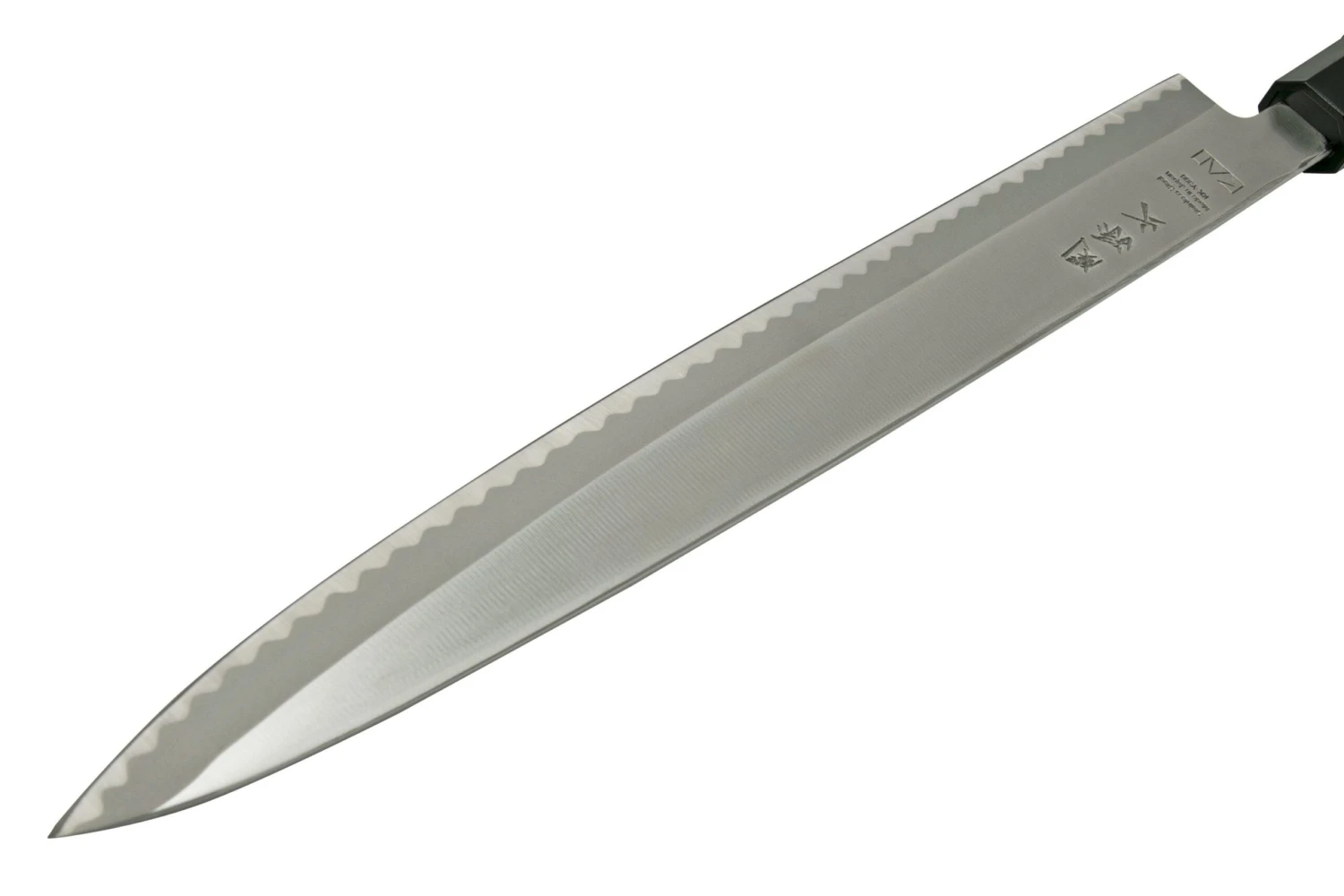 Le Yanagiba 30cm Kai Seki Magoroku KK est un couteau Ă sashimi japonais. Ce couteau a une lame extrĂŞmement longue et fine, qui permet de couper de façon très fine et prĂ©cise. Il convient donc particulièrement pour la prĂ©paration du poisson. La lame ne nĂ©cessite que peu d’entretien, et elle conserve longtemps son tranchant. Les lignes ondulĂ©es satinĂ©es sur la lame sont très esthĂ©tiques.