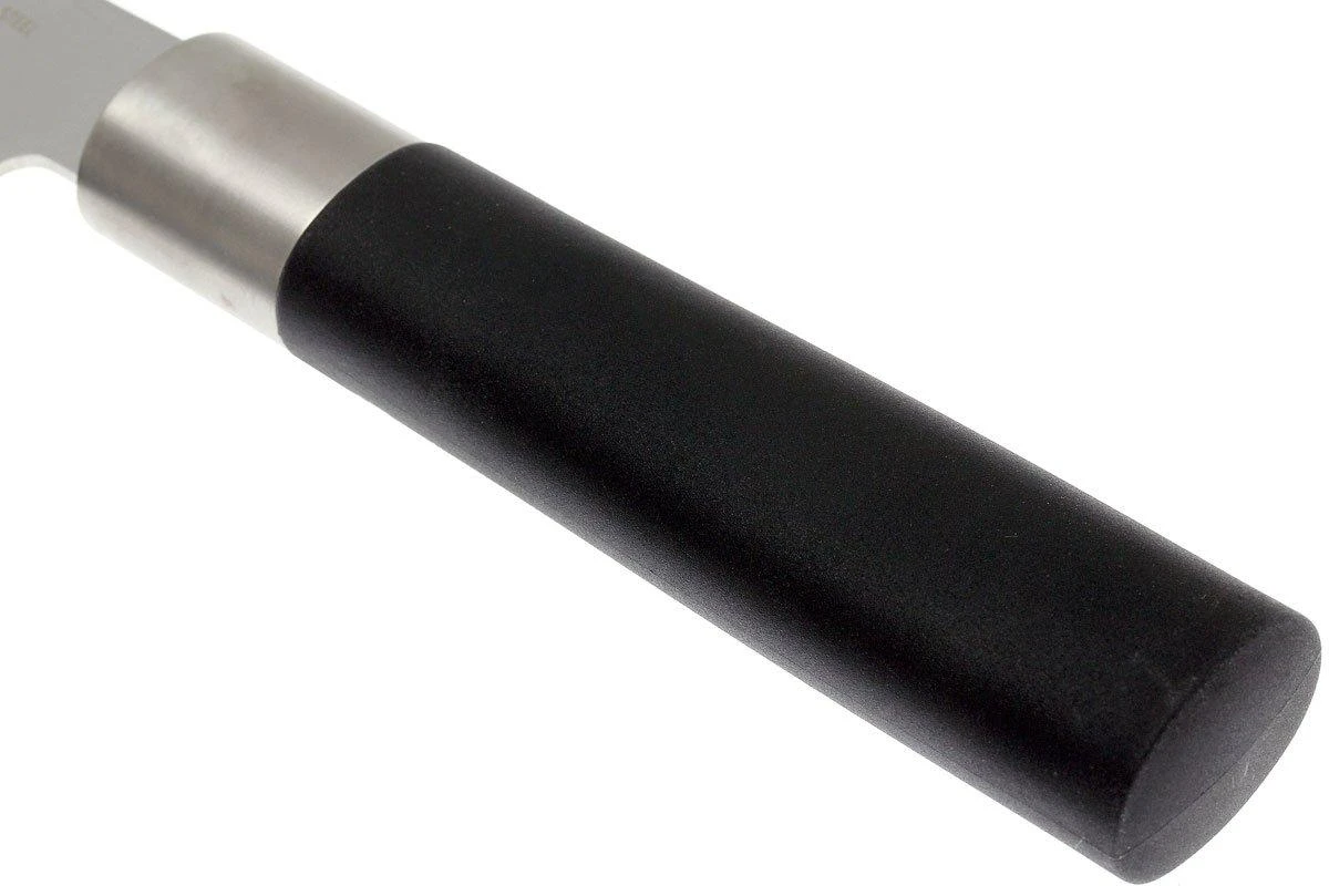 Kai est une marque de couteaux de cuisine réputée pour sa qualité exceptionnelle. La gamme Kai Wasabi permet aux cuisiniers amateurs de s’équiper de couteaux de qualité professionnelle à petits prix. La lame est en acier Daido 1K6, un type d’acier inoxydable durci à 58 HRC. L’absence de mitre vous permet d’utiliser toute la longueur du tranchant. Cela facilite grandement l’aiguisage. Le manche est composé d’un mélange de poudre de bambou et de polypropylène. Il est donc extrêmement durable et résistant à l’eau.