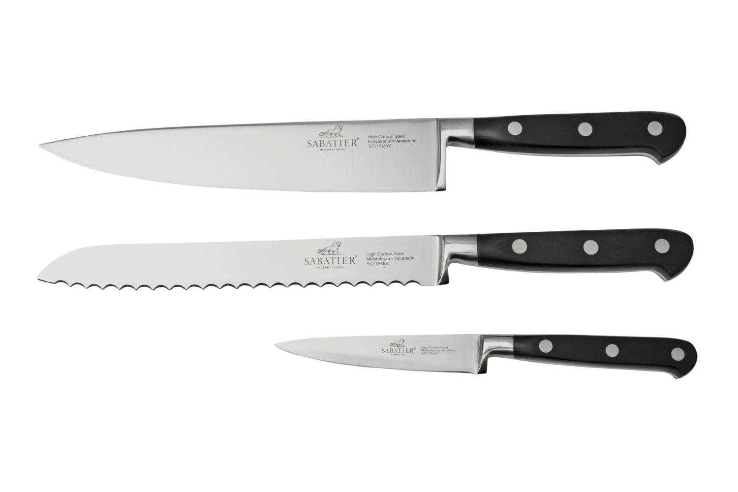 Ce set de 3 couteaux Lion Sabatier International Licorne 774586 est un magnifique set au design classique et bien connu de Sabatier. Le couteau de chef sert à couper de gros morceaux de viande, poisson légumes et autres ingrédients. Le couteau à pain permet de couper sans effort des pains croustillants ou moelleux, des tartes et même de gros légumes durs. Le couteau d’office est idéal pour les petites tâches précises.