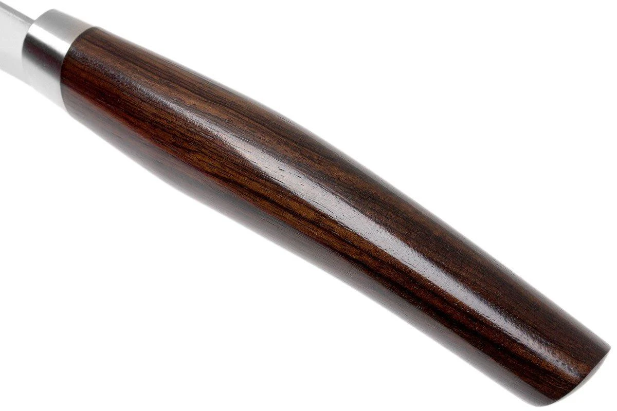 Le manche est fabriqué en bois de Grenadille. Une essence de bois connue pour être extrêmement solide, durable et lourde. La combinaison de ce matériau avec la lame argentée de ce couteau est absolument parfaite. Le manche est très ergonomique pour travailler sans fatiguer.