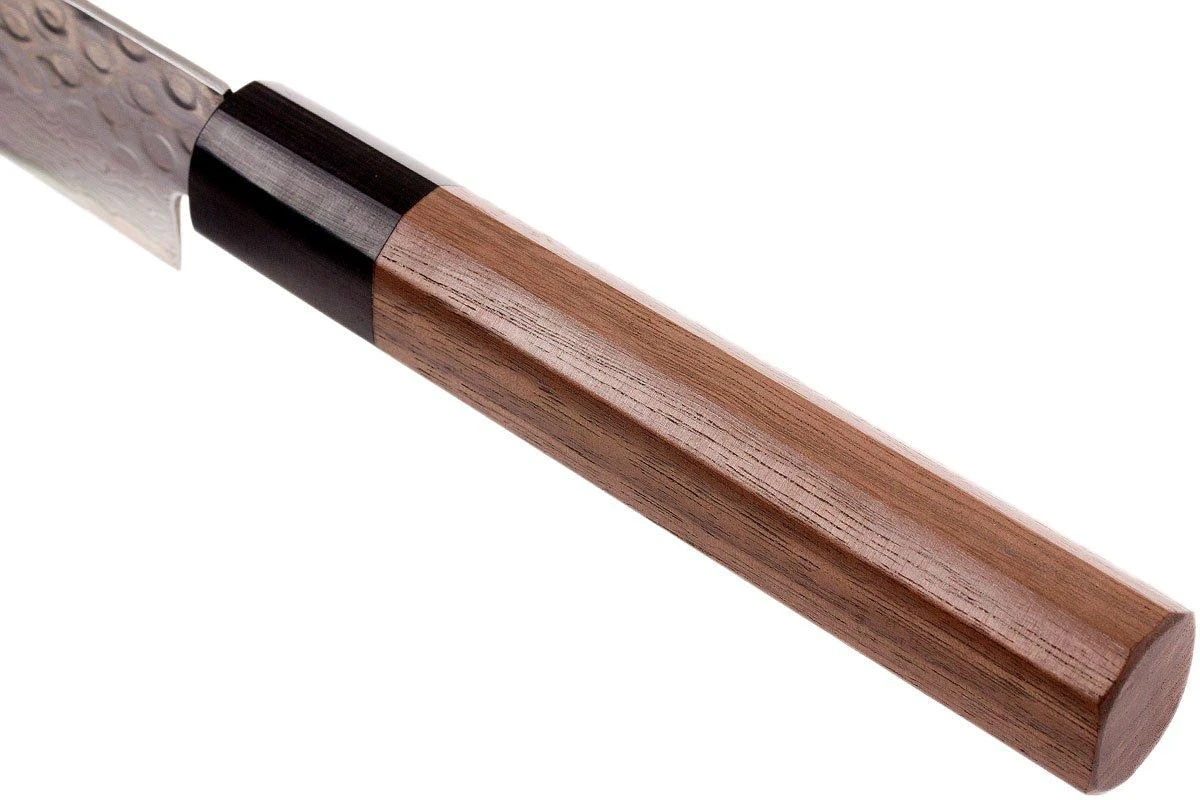 Ce couteau à viande fait partie de la collection 45-Layer Damascus WA de Sakai Takayuki. Ce couteau, aussi nommé sujihiki, a une lame de 24 cm de long. Il convient également pour couper le poisson.
