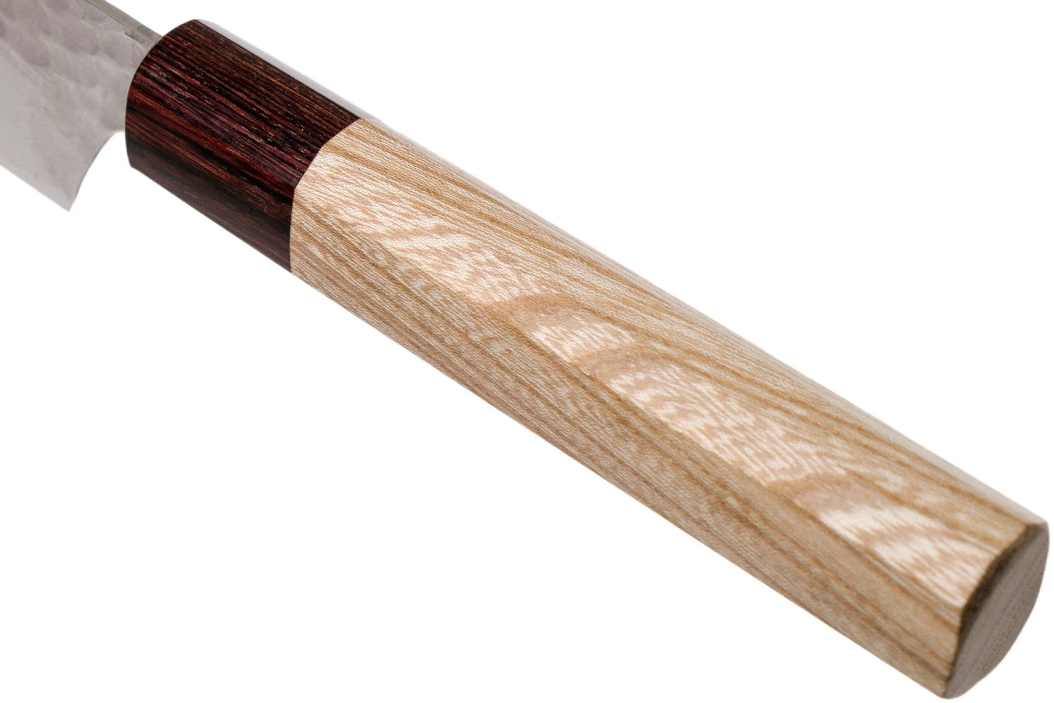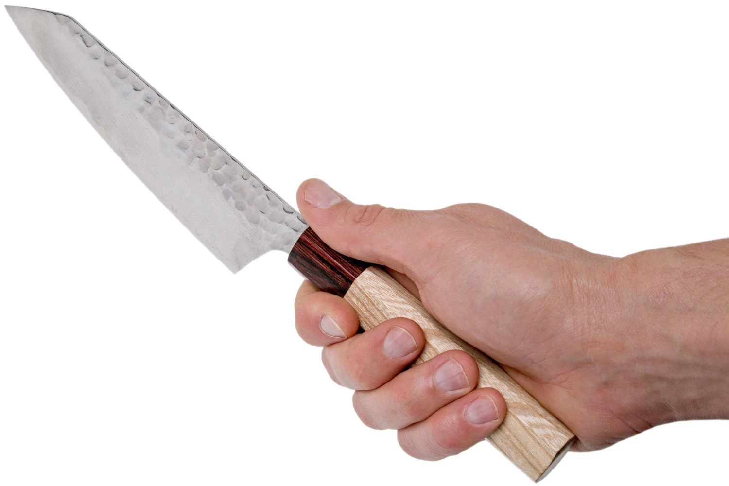 Ce couteau bunka Sakai Takayuki de la gamme 33-layer VG-10 Damascue Hammered WA a une lame kengata. Ce mot signifie »lourdement réfléchi » et fait référence à la forme de la lame qui s’incline brusquement à son extrémité. Ce couteau peur être considéré comme un membre de la famille des santoku. Grâce à sa pointe étroite vous pouvez couper la viande, le poisson et les légumes très finement.