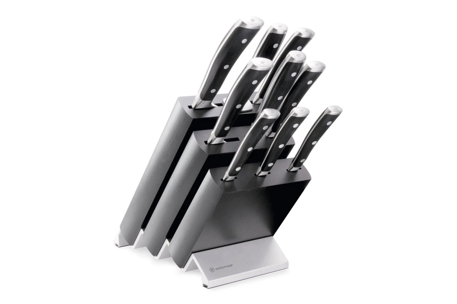 Le set de couteaux Wüsthof Ikon, 9 pièces permet de mener à bien toutes vos tâches en cuisine. Ce magnifique bloc à couteau incliné est un ajout de choix pour votre plan de travail !