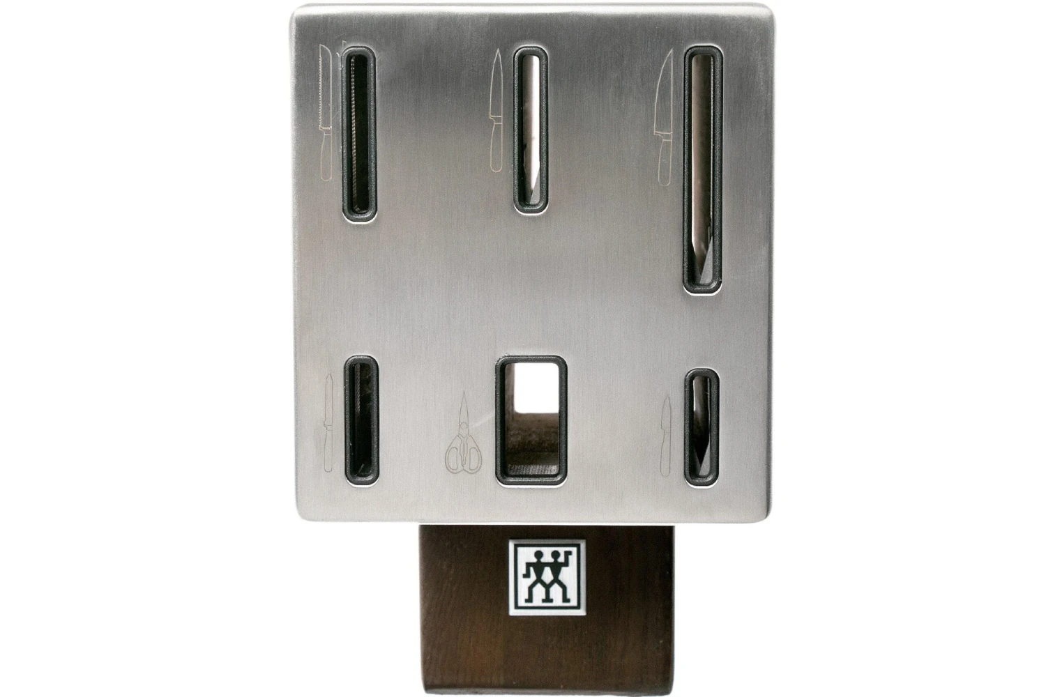 Ce bloc à couteaux Zwilling Gourmet 7 pièces permet d’avoir tous les ustensiles nécessaires à la cuisine. Ce set comprend quatre couteaux de cuisine, un ciseau et un bloc à couteau pour ranger le tout. Ce bloc à couteaux SharpBlock est spécial : il est doté de la technologie KIS. Cela signifie que trois des six fentes (pour les couteaux à lame lisse) sont équipées d’aiguiseurs céramique placés dans un angle d’affûtage parfait. On peut donc aiguiser les couteaux à chaque fois qu’on les sort ou les replace dans le bloc. Chaque emplacement est accompagné d’une icône. Les couteaux sont donc toujours placés au bon endroit. Bref, tout ce qu’il faut.
